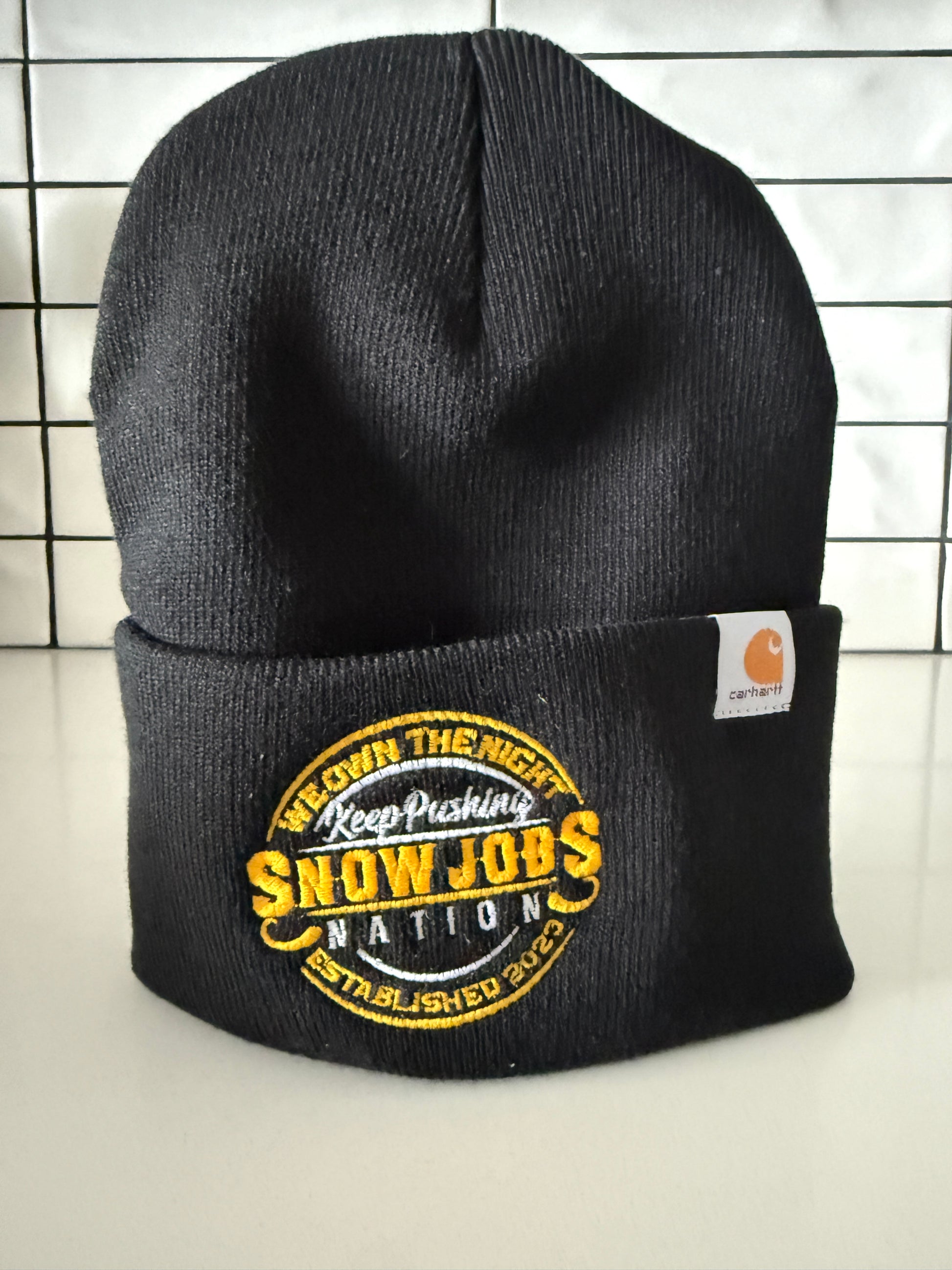 Soft to the touch, this timeless cap is stretchy rib knit for a stay-put fit. 100% acrylic , stretchable, rib knit-fabric. Carhartt label sewn on left side. Embroidered SnowJobs Nation Logo